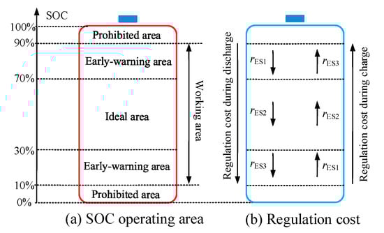 Schematic diagram for energy storage system SOC subarea: (a) Description of the SOC operating area; (b) Description of the regulation cost.