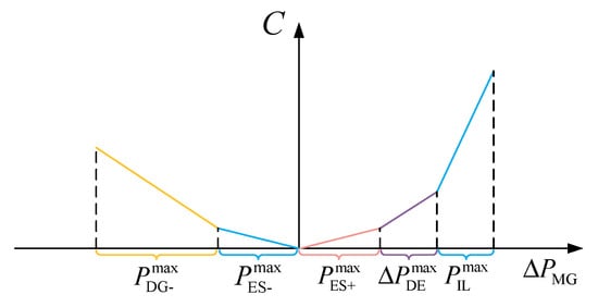 From the previous analysis, it can be seen that the regulation cost of each controllable unit can be approximated as a linear or piecewise linear function (e.g., the SOC variation in the charge and discharge process of energy storage system spans two areas of different unit regulation cost). It can be seen from Figure 3 that, when considering the dispatch priority, this paper can combine the regulation cost model of each controllable unit with the segmental linear function according to the power allocation strategy decision order of positive and negative power commands, that is, the microgrid regulation cost function.