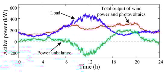 The load curve of the multi-microgrids, the total output curve of wind power and photovoltaics, and the corresponding power imbalance curve are shown in Figure 5, whose data source is an actual islanded multi-microgrid [34]. It can be seen that the power imbalance mainly occurs at 09:00–22:00. On the one hand, due to the large PV output at noon, there is a situation of excess power, and then a power shortage occurs after the peak load arrives at night.