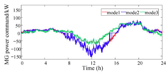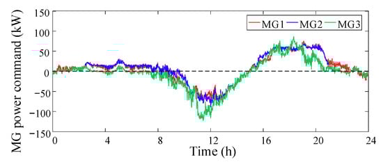 After simulation, the power command of each microgrid basically follows the trend of the total power command. The regulation power of each unit throughout the day and the corresponding microgrid regulation cost are given in Table 3. The total regulation cost of MG1 and MG2 includes the forced cost corresponding to the unadjustable part of the output of the energy storage device. Since MG1 and MG2 are equipped with energy storage devices, the actual regulation costs of MG1 and MG2 are higher than that of MG3. The power command curves of each microgrid and the output curves of various distributed generations are shown in Figure 6 and Figure 7, respectively.