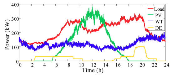 After receiving the allocated power command, each microgrid needs to decentralize the power commands of the controllable units according to the power allocation strategy. It is assumed that each microgrid includes the following units: photovoltaic (PV), wind turbine (WT), energy storage device (ES), and controllable micro-power sources, such as diesel engine (DE) or interruptible load (IL).