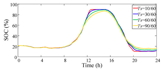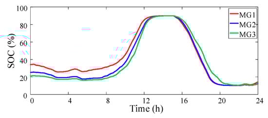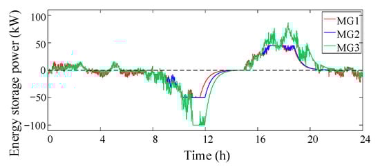 The results of charge and discharge power control of each microgrid energy storage unit are analyzed. The real-time power curve and SOC curve of each microgrid energy storage unit are shown in Figure 8 and Figure 9. It can be seen that the energy storage units of each microgrid are charged during the period of excessive photovoltaic output during the daytime, and discharge is completed during the peak load period, which is in accordance with the scheduling rules. The SOC change trend of each energy storage is basically the same, the capacity can be effectively utilized, and the power command allocation is reasonable.