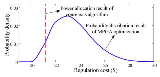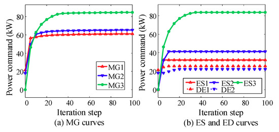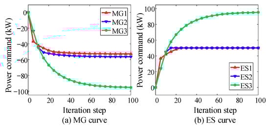 The error adjustment step size can be artificially given an appropriate parameter or adaptively adjusted by detecting . The meaning of Equation (10) can be explained as follows: taking the current total power command as an example, if , the sum of the power commands of each microgrid is still insufficient to balance the current power imbalance, and the regulation cost needs to be increased accordingly; if , the regulation cost can be reduced.