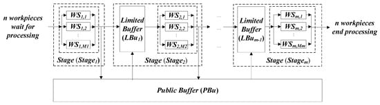 With rapid development of information, advanced manufacturing, and artificial intelligence technology, Germany proposed “Industry 4.0” national strategy, which promotes progress in manufacturing industry and provides producing solution schemes for many complex industrial systems [,,]. In the production of steel casting, assembly of heavy machinery, and other industries, a scheduling problem with non-deterministic polynomial hard (NP-hard) attributes [,,,,], such as the flexible flow shop scheduling problem with the characteristics of customized production and parallel processing, was experienced [,]. During the actual production of the large equipment manufacturing workshop, only the buffer with limited capacity can be set in the workshop, owing to physical factors such as the workshop space and storage equipment capacity. When the required capacity of the production task fluctuates in the workshop or the takt time between stages is inconsistent, the buffer capacity might reach the upper limit. Consequently, the completed workpieces that are ready to enter the limited buffer cannot enter the buffer for temporary storage; they are stagnant on their processing workstation while waiting for available space in the limited buffer, which effectuates production blockage, thereby delaying the production process [,,,]. In the actual production of a large equipment manufacturer, it is uncommon to configure the limited buffer with redundant capacity or to temporarily adjust the capacity of limited buffer to avoid the production blockage. The manufacturer often sets up the public buffer in the workshop to dynamically receive workpieces that cannot enter the limited buffer between the stages. This is equivalent to dynamically expanding the capacity of the limited buffer, which can reduce the production blockage and ensure fluent production process. In the actual workshop, the public buffer is often located at a designated position not adjacent to the workstation due to physical factors such as production space. Thus, the transit time between the workstation and public buffer cannot be neglected. It creates the transfer scheduling problem of the workpiece between limited buffer and public buffer, which further increases the uncertainty of the scheduling result and the difficulty of resolving the scheduling problem []. Consequently, it is necessary to explore an effective scheduling method for the flexible flow shop scheduling problem with public buffer (FFSP–PB) due to its role in reducing the production blockage and improving the utilization of production resources [,]. Therefore, it is of great theoretical and engineering value to solve this problem.