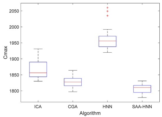 From the simulation results in Table 6 and Table 7, under medium-scale data, the main evaluation index makespan of the SAA–HNN algorithm decreases to 129.3, 96.52, and 188.47 in comparison to the ICA, CGA, and HNN algorithms, respectively, and the improvement is 15.50%, 12.04%, and 21.10%, respectively. Under large-scale data, the main evaluation index makespan of the SAA–HNN algorithm decreases to 415.23, 271.44, and 564.19 in comparison to the ICA, CGA and HNN algorithms, respectively, and the improvement is 23.14%, 16.44%, and 29.03%, respectively. Under medium-scale data and large-scale data, other evaluation indexes of the SAA–HNN algorithm also improve. The SAA–HNN algorithm performs optimally and has perfect adaptability during the solving of the FFSP–PB of medium-scale and large-scale data.