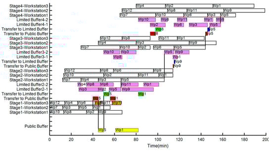 Figure 4 shows the Gantt chart of the scheduling result of Scheme 3. The abscissa is the time axis, while the ordinate indicates the workstation of each stage, the limited buffer, and the public buffer. The violet part in the figure represents the time for the workpiece that is temporarily stored in the limited buffer; the red part indicates that the electric flat carriage transfers the workpiece from the workstation to the public buffer; the blue part indicates the time for the electric flat carriage that transfers the workpiece back to the limited buffer when transporting the workpiece from the workstation to the public buffer; the yellow part denotes that the workpiece is stored temporarily in the public buffer; the green part denotes that the electric flat carriage transports the workpiece from the public buffer to the limited buffer; the orange part in the figure represents the blockage time of the workpiece in the stage. Figure 4 demonstrates that restricted by Equation (6), the workpiece in each stage is processed only once at one workstation, and hence, the processing route of the workpiece is , i.e., the processing route is represented by the connecting lines between the blocks in the figure.