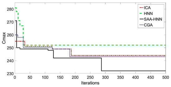 From the above analysis of the scheduling evolutionary process, the SAA–HNN algorithm not only maintains the fast optimization characteristics of the HNN algorithm, but also jumps out of the local extremum and continues evolution in the process of solving the FFSP–PB problem with the improved local scheduling rules. Also, the SAA–HNN algorithm has better optimization effect than the ICA and CGA algorithms.
