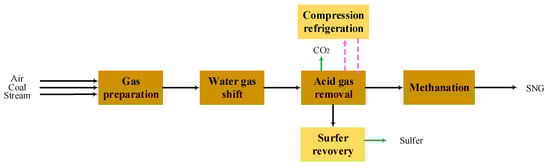 Figure 2, including coal gasification, water–gas shift, acid gas removal, and methanation synthesis units [
