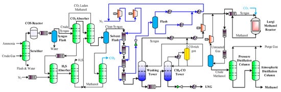 Figure 4. In this process, the syngas from the Lurgi gasifier is separated to get LNG product by cryogenic separation unit. The remaining syngas has the H:C ratio close to 2.4. An additional carbon source is needed to decrease that ratio near to 2.1 before methanol synthesis. In that case, the additional carbon resource can be provided by CO