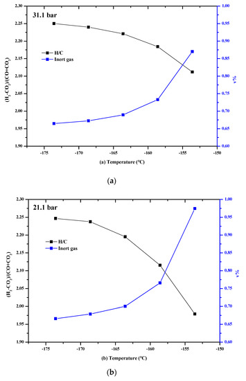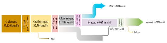 Figure 11 shows the carbon elemental balance in the new process. It shows that the input molar flow in raw material coal of CTLNG-M system is 27,416 kmol/h. The molar flow of carbon in the crude syngas is 27,141 kmol/h after gasification, and gets 11,749 kmol/h carbon elements when washed with methanol at a low temperature. In the cryogenic separation unit, the molar flow of carbon in the LNG product is 4284 kmol/h. Remaining clean syngas is mixed with the pure CO