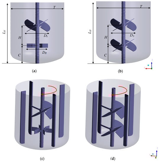 The fermenter geometries (front view) (a) with the Segment–Rushton impeller and (b) with the Segment–Segment impeller: the baffles were removed for clarity; (c,d) the fermenter geometries including baffles.