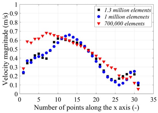 Initially, the influence of grid numbers on the CFD results (grid independence) was tested. Two rotating zones around the two impellers were defined with the finer mesh sizes. The grid size around the impellers was 1/3 of the grid size in other regions of the simulation domain. Three different simulation cases with 700,000, 1 million, and 1.3 million mesh elements (i.e., unstructured tetrahedral elements) were simulated to find the optimal mesh size (i.e., number of mesh elements). To obtain the desired mesh element sizes and numbers, the sizing function in the ANSYS meshing tool was used. The velocity magnitude on a line crossing the fermenter at the Segment impeller height (Z = 0.187 m) was used as a parameter to evaluate the mesh quality. The comparison between cases was performed when a steady-state condition was achieved. Tracking the values of torque obtained from simulations demonstrated that the torque value did not change considerably between 10 to 15 s of simulations. This confirmed that the steady-state condition was reached at around 10 s of simulations. As seen in Figure 2, the instantaneous velocity magnitude values obtained from simulations with 1 and 1.3 million mesh elements showed similar trends and were relatively close, with around a 10% difference in their averaged values. This small discrepancy between results might be tolerated for the sake of shorter computational time obtained from the simulation with 1 million mesh elements. The simulation with 700,000 mesh elements showed a different trend in comparison with other simulation cases. Comparing the velocity magnitude values obtained from simulations with 700,000 with those obtained from simulations with 1 and 1.3 million mesh elements showed relatively high differences in their values. Therefore, 1 million mesh elements were used in all simulations in the current study, as it provided a compromise between computational time and simulation accuracy.