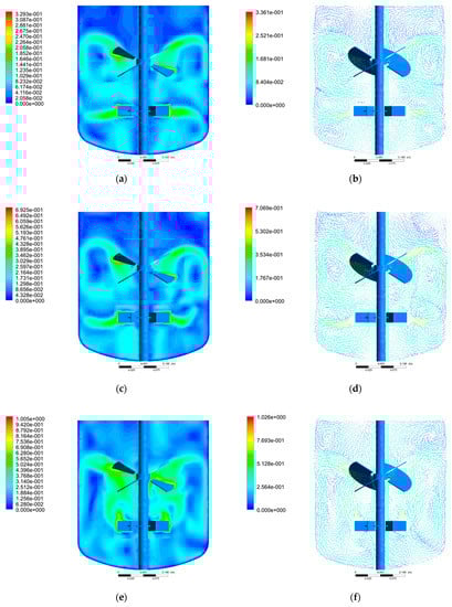 As it can be seen in Figure 3, at low RPM (Case 1), two impellers operated independently. As expected, the Rushton impeller acted as a radial and the Segment impeller acted as an axial impeller (Figure 3a,b). Four liquid circulation loops were observed around the Rushton impeller, and two circulation loops were formed by the Segment impeller. As the RPM was increased to 100 (Case 2), it seemed that the axial flow of the Segment impeller affected the fluid flow around the Rushton impeller and the radial discharge flow of the Rushton flow got distorted. The flow circulation loops around the Rushton impeller were not easily noticeable. As the RPM was further increased to 150 (Case 3), the interaction between the impellers increased considerably, and as seen in Figure 3e,f, the Rushton impeller did not operate as a radial impeller. The high axial velocity created by the Segment impeller impacted the fluid flow around the Rushton impeller and changed its hydrodynamic behaviour. As observed, two impellers interacted and two circulation loops were created in the fermenter tank by the impellers.