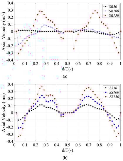 To further analyze the abovementioned hydrodynamic flow patterns, the axial velocity values on a line between two impellers at z/LH ~ 0.45 were extracted from all simulation cases. As seen in Figure 5a,b, when RPM increased the axial velocity, values increased for both impeller configurations. From Figure 5a, it is also observed that, for the simulation case, with the lowest RPM (50), the axial velocity had extremely small values, demonstrating a minimum interaction between impellers, and that two different fluid-flow compartments were formed by the impellers in the tank. For the simulation case with 150 RPM, however, the axial velocity increased considerably compared to other simulation cases due to the impact of the Segment impeller on the liquid flow around the Rushton impeller.