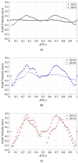 Effect of impeller configuration on axial velocity profiles: (a) 50 RPM, (b) 100 RPM, and (c) 150 RPM (SR and SS stand for Segment–Rushton and Segment–Segment impeller configurations, respectively).