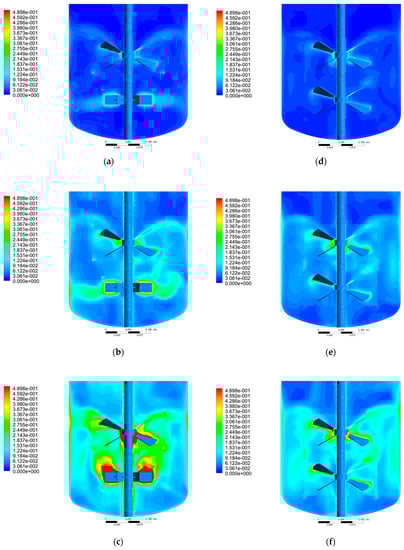 The velocity contours and vectors of these simulation cases (Figure 3) show the abovementioned hydrodynamic shift. In Figure 3a–d, it is seen that both impellers operated relatively independently with a slight interaction. However, as the RPM increased to 150 (Figure 3e,f), the high axial velocity created by the Segment impeller drastically affected the fluid flow around the Rushton impeller and a high axial velocity was also seen close to the Rushton impeller. Therefore, in this case, the Rushton impeller did not act as a radial impeller. The  total value of Case 3 was quite different compared to the  total values of Cases 1 and 2. This difference can be attributed to the different hydrodynamic behaviour of Case 3 compared to Cases 1 and 2.