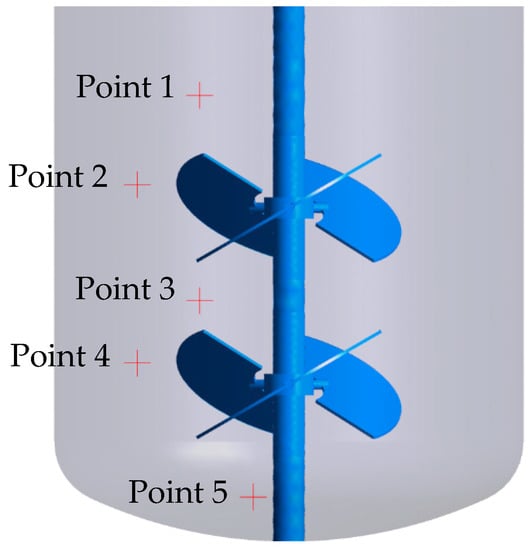 where  is the mass-diffusion coefficient,  is the turbulent viscosity, and  is the turbulent Schmidt number. In all simulations, the value of  was taken as 10−9 (m2/s) [] and  equals 0.7 (which is the default value in the CFD software) []. Five monitoring points (as shown by “+” in Figure 8) were defined in the vessel in order to track the changes of the tracer mass fraction during mixing. These monitoring points were selected in order to have a point above the upper impeller, a point below the lower impeller, two points at the impellers level, and a point between the impellers. This selection of monitoring points enabled to collect data regarding the tracer mass fraction in the entire tank height.