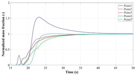 A typical tracer response curve for all monitoring points is seen in Figure 9. For the closest monitoring points to the injection point (Point 1), the tracer mass fraction increased rapidly at the beginning of the simulation and then decreased toward 1 as the mixing time progressed. The tracer mass fraction at other points increased gradually toward 1. The mixing time was calculated as the time period between the start of the injection of the tracer and the time when the mass fraction of the tracer at all monitoring points reached 100 ± 5% of the steady-state value [].