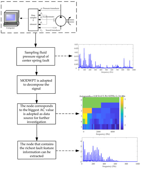 Fluid plays an important role in the power transmission of the hydraulic system or component [1,2]. Because of hydraulic impact and mechanical faults, fluid flow pressure is very complex and nonstationary in hydraulic systems or components. Meanwhile, there are many background noises due to high and low pressure conversion, fluid pressure impact, cavitation phenomenon, fluid pulsation, and so on. The above aforementioned noises can cause problems in the fault feature extraction of the hydraulic systems or components based on the fluid pressure signal. Much running condition feature information is contained in the fluid pressure signal. Therefore, pressure fluctuation can reflect the running condition of the hydraulic system or component [3,4,5,6,7,8]. Fault diagnosis for the hydraulic systems or components based on the fluid pressure signal has been studied by many scholars at home and abroad [9,10,11,12,13,14,15,16]. Zhang put forward a method of flow measurement based on the new sensor, where the flow rate could be measured in hydraulic system by applying the mathematical model, and then flow detection of a 7 piston-pump was realized based on the sensor signal [9]. Goharrizi utilized the Hilbert- Huang transform to decompose the pressure signal of hydraulic actuators, and the first intrinsic mode function was used as a data source, and then the root mean square extracted from it could be adopted to detect internal leakage and its severity effectively. This was done without requiring prior knowledge about the model of the actuator or leakage [10]. Vásquez proposed an active model-based algorithm of fault detection and isolation. With the help of frequency-domain estimators, continuous-time models in a user-defined frequency band were identified. Then, a method for fault detection and isolation was adopted to diagnose early faults in hydraulic actuators based on the fluid pressure signal [11]. Aiming to resolve the serious influences of pressure fluctuation and other noises in the pressure signal, Tang applied a method of wavelet theory to decompose the signal, obtaining the wavelet energy of fault feature information can be got. Then, the inner leakage fault of the hydraulic cylinder could be diagnosed [12]. In order to diagnose the faults in reciprocating pumps, a fluid pressure signal in pump cylinder was analyzed. Frequency energy was extracted for the feature vectors, and then the improved neural network was used to diagnose the pump fault successfully [13]. Guo proposed a pre-filter combined with threshold self-learning wavelet algorithm. The denoising threshold could be self-learnt in the steady flow state, and its noise suppression effect was better than that of the traditional wavelet algorithms based on fluid pressure signals of hydraulic pipeline [14]. You proposed a fusion method using the hybrid particle swarm optimization algorithm and wavelet packet energy entropy. Neural network weights and threshold were optimized by the algorithm, and wavelet packet energy entropy was used for the eigenvector, and then the fault of hydraulic system could be diagnosed effectively [15]. In contrast to the traditional way of detecting the ship fault in the time domain, Li presented a novel method in the frequency domain. The method decomposed the hydraulic pressure signal using the wavelet-transform technique, and reconstructed it at the low-frequency region; thus, the ship fault could be diagnosed effectively [16].
