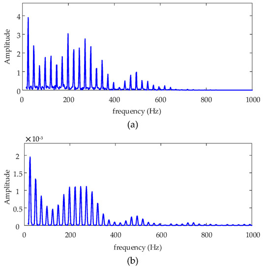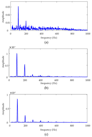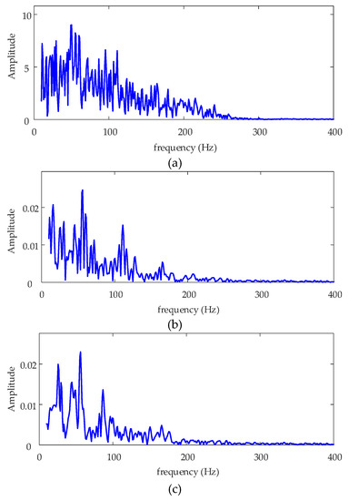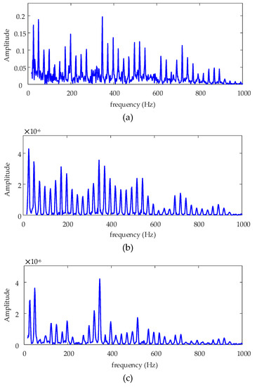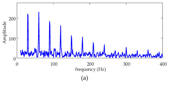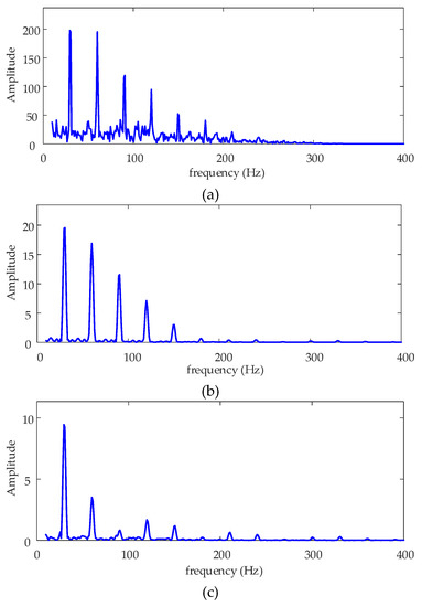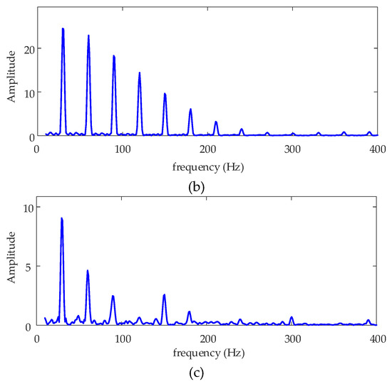 It can be seen in Figure 8 that the simulated fault feature information at fault feature frequency 30 Hz with some harmonics can be extracted. The amplitude values obtained based on no threshold processing in Figure 8a are the larger than in Figure 8b,c, and the amplitude values in Figure 8 are all larger than those in Figure 2. Thus, lower Autogram is effective in extracting the information, and its extraction ability based on no threshold processing is the strongest.