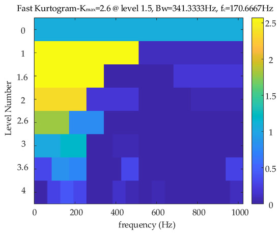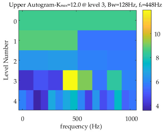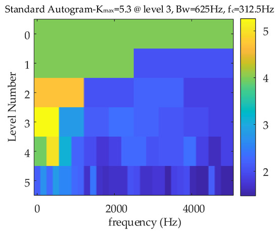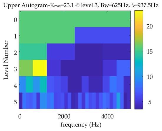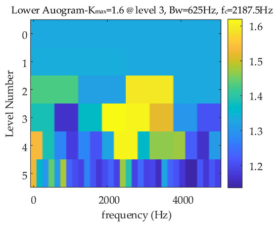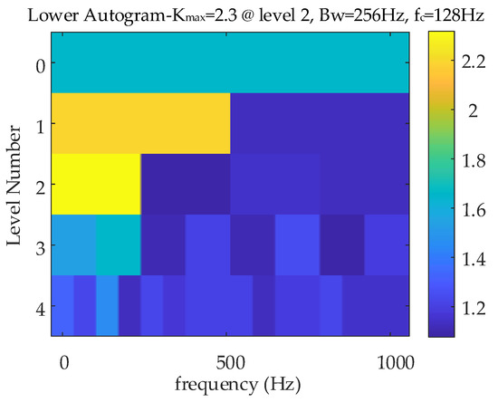 This step is to select the node, and let the node be data source for further fault feature extraction. The proposed method is different from FK, because the kurtosis of Autogram is computed based on the AC of the node of each level. Subsequently, the kurtosis values of all nodes, similar to FK, are presented in a colormap for which the color scale is proportional to the kurtosis value, and the vertical and horizontal axis represent the level of the MODWPT decomposition and frequency, respectively.