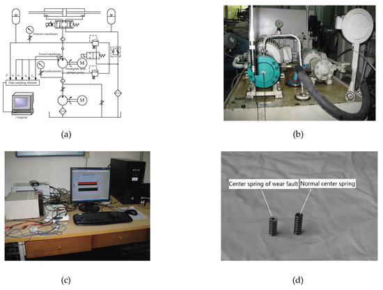 Swashplate axial plunger pump experiment systems. (a) Schematic diagram; (b) Swashplate axial plunger pump; (c) Data acquisition equipment; (d) Invalidation spring and the normal spring.