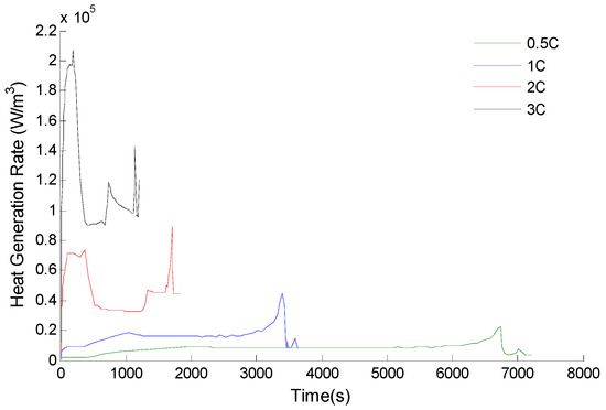 The effective physical parameters of the electrodes calculated by Equations (5) and (6) are applied to the electrochemical thermal coupling model, and then the change curves of the heat generation rate of the battery as shown in Figure 3 are obtained by simulating under different discharge rates.