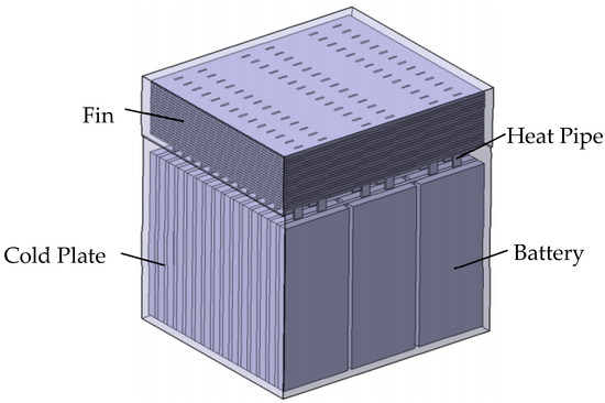 According to the design of the fins, heat pipes and cold plates in the heat pipe cooling system, the structure of the heat pipe system is shown in Figure 4. A battery pack consists of 45 pieces of 180 mm × 80 mm × 10 mm LFP batteries. Cold plates are inserted into the gap of each row of batteries, and each of the cold plates is embedded with six heat pipes. Twenty 2 mm thick fins are installed at the condensation section of the heat pipe, and convection heat transfer is carried out through the air with a certain flow velocity and fins.