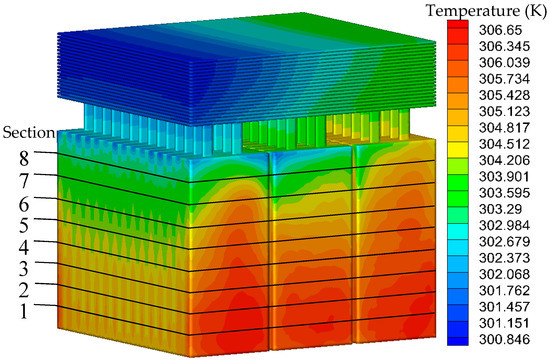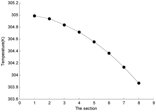 As shown in Figure 6, there are 8 sections in the z-axis direction of the battery intercepted with an equal distance of 20 mm. The average temperature of the section is read through FLUENT post-processing, and then the line diagram is drawn as shown in Figure 7. It can be seen from the results that the battery temperature decreases gradually in the direction close to the fin, and the effect of the heat dissipation is the best at Section 8. Among the 8 sections, the highest average temperature is 304.992 K, the lowest is 303.871 K, and the average temperature difference is only 1.121 K, so the temperature uniformity is good.