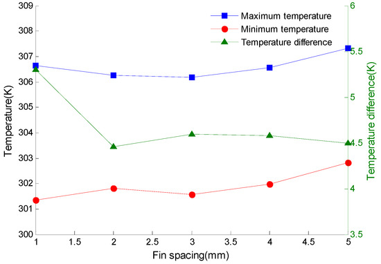 It can be seen from Figure 8 that with the increase of fin spacing, the maximum and minimum temperatures of the battery pack increase, while the temperature difference of the battery pack decreases first and then increases. When the spacing is 2 mm, the temperature difference of the battery pack is the smallest, which is 4.46 K. As the fin spacing continues to increase, the temperature change rate of the battery pack gradually decreases, and the temperature difference curve tends to be flat. At this time, if the fin spacing is further increased, and the heat dissipation capability of the fins will not be greatly increased.