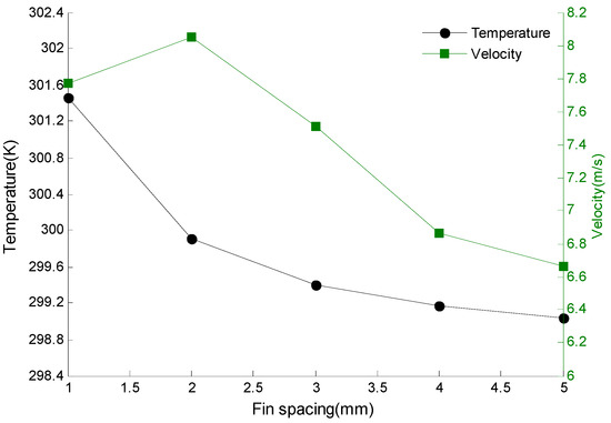 The velocity and temperature of the middle layer of fins varying with fin spacing.