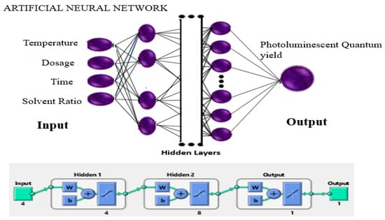 A multi input and a single output artificial neural network model was developed by utilizing the Levenberg–Marquardt back propagation (LMBP) algorithm to effectively predict the photoluminescent quantum yield of synthesized fluorescent carbon dots [,].