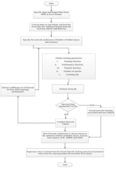 Nwobi-Okoye and Ochieze [] made a study based on the comparison of Response Surface Methodology (RSM) and Artificial Neural Network (ANN) data to validate the prediction of aluminum alloy A356/cow horn particulate composites hardness. The study confirmed that ANN with R2 of 0.9921 exhibited better accuracy than the RSM with R2 of 0.9583 in predicting the hardness values of the composites []. The ANN model is generally based upon artificial intelligence (machine learning), under which a predefined set of data is being trained [,], validated, and tested for prediction purposes. Due to this constraint, it is worthy to note that the values predicted by ANN will not often be the best predicted values, but will be within the range of the experimental study [,].