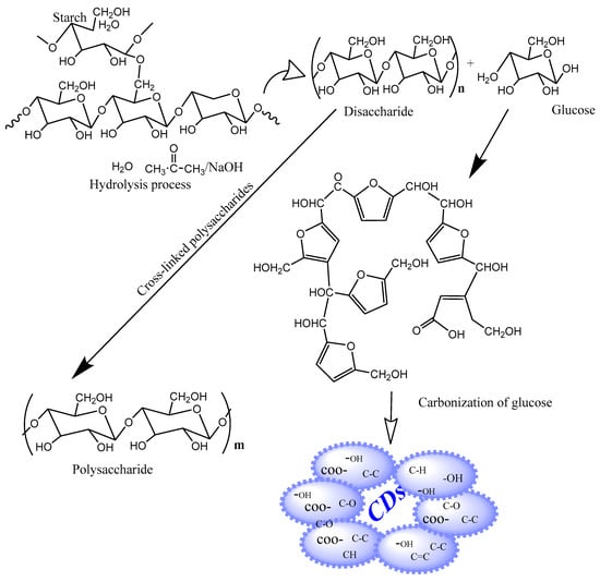 An environmental suitable technique for producing carbon dots, (hydrothermal synthesis process), were adopted from the response surface methodology analysis. The best photoluminescent quantum yield data were used here for the report of the response. A small quantity, (0.1 g), of tapioca flour was mixed in 12 mL prepared solvent ratio (deionized water + sodium hydroxide + acetone), see Figure 3 for mechanism flow. This mixture was placed in a stainless steel hydrothermal reactor in a convection oven at a temperature of 170 °C for a period of 1 h 40 min. This study has successfully reduced the needed temperature and time needed for synthesizing CDs [,,].