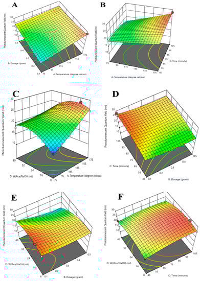 Figure 4D shows a non-effective interaction between dosage (B) and time (C) on the response of photoluminescent quantum yield. p-value at 0.5430 and f-value of 0.3875 all fall short of the requirement of a p-value <0.100 and an f-value that is extremely low. The interactive effect of dosage (B) and solvent ratio W/Ace/NaOH (D) at p-value 0.0008 as shown in the 3D plot on Figure 4A,C,E,F is the most important factor in the sustainability of environmental resources. Environmental resources management is an essential factor to be considered in the synthesis of products, with high emphasis on minimal resource requirement [].