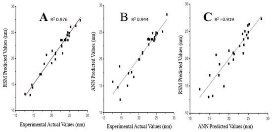 Parity plots; (A) Response Surface Methodology (RSM) predicted against experimental actual values. (B) Artificial Neural Network (ANN) predicted against experimental actual values. (C) RSM predicted values against ANN predicted values.