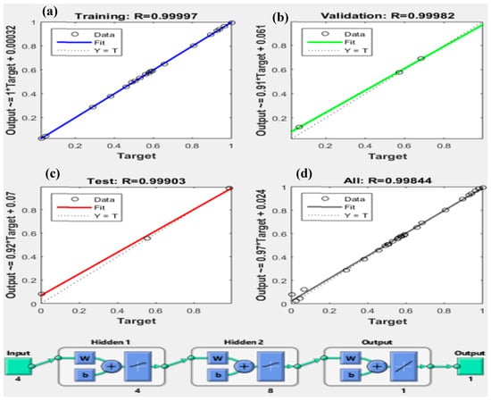 Artificial neural network model coefficient of determination and error relationship of data set of fluorescent carbon dots. (a) Trained R2 output, (b) Validated R2 output, (c) Test R2 output, and (d) Overall R2 output of data set.