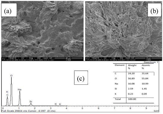 From the conducted FESEM analysis, it is found that the actual shape of the CDs is in the form of a flower shaped petals, spherical in nature, as can be seen in Figure 8a,b. The EDX study determined the elemental compositions of carbon dots, and the results shows presence of C (31.64%), 0 (55.84%), Na (10.99%), Si (1.45%), and K (0.079%) as in Figure 8c. The Na signal in EDX spectrum is due to the sodium hydroxide constituent of carbon dots synthesis and silicon is as result of glass substrate for drying carbon dots during the sample preparation for FESEM.
