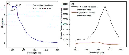 The use of UV lamp to assess the quality of fluorescent carbon dots have been applied as a source to obtain a blue/green color in the near visible region of color band group. The UV irradiations absorbed by the carbon dots and excited through absorbing the energy leading to an electron excited state. The molecules of carbon dots with extended Pi-electron provides the basics for the fluorescence emission of carbon dots. The tapioca-derived carbon dot is a wavelength dependent photoluminescent ionic solution in the visible range with a surface abundant with hydroxyl and carboxylic/carboxyl moieties [].