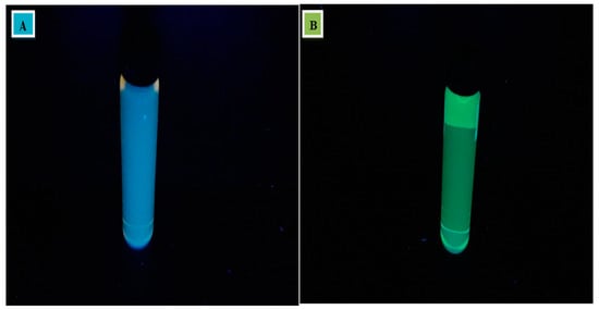 Tapioca powder as source of fluorescent carbon dots. (A) Carbon dots after synthesis emitting blue fluorescence. (B) Carbon dots emitting green fluorescence after 3 months of synthesis.