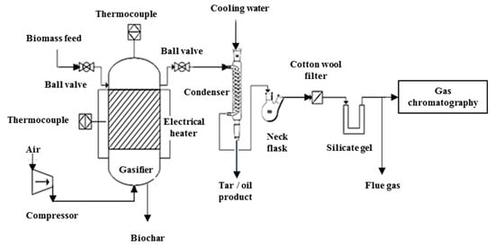 The gasification of the shredded Napier grass was conducted in a fluidized bed gasifier. The reactor was cylindrical with 370 mm high and 54 mm wide, made of stainless steel. The schematic of the experimental rig is shown in Figure 1.