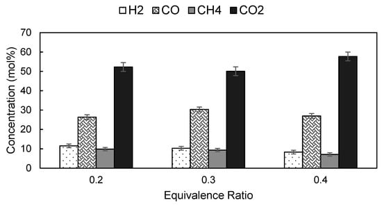 In this study, the ER was manipulated by varying the air flowrate while the biomass feeding rate remained unchanged. The effects of ER on product yield are shown in Figure 3. Bio-gas and bio-liquid yields recorded an upward trend with increasing ER while the bio-char demonstrated the opposite. The ER is an indicator of the quantity of oxygen supplied to the reactor and gasification temperature under autothermal operation [29]. Higher ER leads to higher gasification temperature, accelerates oxidation reactions and leads to enhanced product quality. Conversely, lower ER limits the amount of oxygen available for gasification reactions and therefore is not a favorable condition [31].