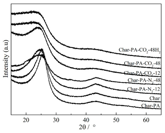 First, the values of AD1/AG, AD3/AG and AD4/AG of Char-PA obviously decrease when compared to those of Char. In the process of CO2 activation, the defective structure at the edge of the aromatic layers and some small aromatic rings are consumed preferentially [43].The consumption of the defective structure can promote the dehydrogenation of the big aromatic rings; and the removal of the small aromatic rings can help the inner reactivation of the big aromatic rings accompanied by the breakdown of the cross-linking structure [44]; these changes finally lead to a substantial increase in the quantities of crystalline sp2 bonding carbon atoms, which further promotes the stability of the carbon structure. Then, with the increase of the ball-milling time from 12 to 48 h, the values of AD1/AG and AD4/AG of Char-PA-N2/CO2-12/48 increase gradually; but there is a slight increase in the value of AD3/AG. It can be inferred that a strong mechanical collision caused by the ball milling has partly destroyed the crystalline sp2 bonding carbon structure, decomposing it into the big aromatic rings, which is accompanied by the formation of new crosslinking structures. In particular, the variety of the hybrid carbon parameters of Char-PA-CO2-12/48 is more obvious than that of Char-PA-N2-12/48 under the same ball-milling time. Some oxygen atoms from dry ice are easily bonded and fixed to the carbon matrix in the form of cross-linking bonds (such as -COO- and -O-), and some oxygen-containing heterocycles under a local high temperature are caused by a strong mechanical collision; furthermore, the presence of O-containing structures can also promote the reorganization of aromatic fragments to form more big aromatic rings.