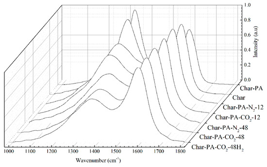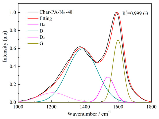 The Raman spectra of the samples produced under pyrolysis and different activation conditions are shown in Figure 5. There are two obvious broad diffraction peaks at 1230–1450 cm−1 (D peak) and 1450–1580 cm−1 (G peak) in all of the samples. Some researchers [40,41] have found that the widening of the D and G peaks is serious for incomplete graphitized materials in Raman spectra, indicating the existence of many sp2-hybridized structures and sp2–sp3 hybridized structures. Thus, it is necessary to resolve overlapped peaks using a fitting treatment, including for the D1 peak (1300 cm−1), D3 peak (1520 cm−1), D4 peak (1200 cm−1) and G peak (1550 cm−1). Figure 6 shows the fitting curve of the Raman spectrum for Char-PA-N2-48. Furthermore, the D1 peak is represented as the defective sp2 bonding carbon atoms; the D3 peak is represented as the amorphous sp2 bonding carbon atoms; the D4 peak is represented as the sp2–sp3 bonding carbon atoms; the G peak is represented as the crystalline sp2 bonding carbon atoms; furthermore, the relative quantities of different hybridized structures is as follows: (1) AD1/AG represents the relative quantity of the big aromatic rings, including C–C between aromatic rings and aromatics with no fewer than 6 rings with a defective structure; (2) AD3/AG represents the relative quantity of the small aromatic rings including aromatics with 3–5 rings and the semi-circle breathing of aromatic rings; and (3) AD4/AG represents the relative quantity of the cross-linking structure, including Caromatic–Calkyl, aromatic (aliphatic) ethers and C–C on hydroaromatic rings [42]. The results of the different hybrid carbons in the form of area ratios of the samples are shown in Table 3.