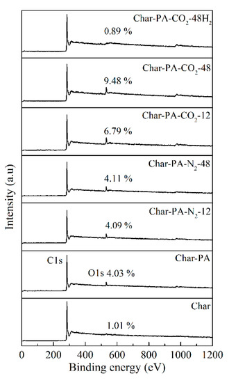 Figure 8 shows the broad scanning energy spectrum of all the samples, determined by XPS in the range of 10–1200 eV binding energy to obtain the strongest peak for most elements. There are two obvious peaks (C1s and O1s peaks) in Char-PA and Char-PA-N2/CO2-12/48, indicating the dominant position of C and O in the element composition; however, the disappearance of the O1s peak of Char is related to the release of the oxygen elements in the form of small molecules (such as CO, CO2) during pyrolysis. With the increase of the ball-milling time from 12 to 48 h, there is a slight increase in the oxygen content of Char-PA-N2-12/48 from 4.09% to 4.11%. A ball milling under dry ice can rapidly promote the combination of surface unsaturated carbon atoms with CO2 to fix a large number of O atoms in the form of oxygen-containing functional groups; thus, the oxygen content of Char-PA-CO2-12/48 increases rapidly from 6.79% to 9.48%.