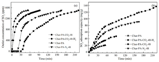 First, the efficient adsorption of Char-PA is mainly presented within only 60 min, while the SO2 concentrations of the gas outlet arrive quickly 1500 ppm; this result indicates that Char-PA has already been penetrated by SO2. In addition, Char-PA can only achieve 21.2 mg/g at the end of the experiment. Therefore, Char-PA, with undeveloped pores and fewer activated sites, can only maintain an efficient SO2 adsorption and conversion at the initial stage. Then, the SO2 adsorption of Char-PA-CO2-48 can be maintained at 100% within 30 min. After that, there is a slow increase from 70 to 1500 ppm in the SO2 concentrations of the gas outlet, and its SO2 adsorption capacity can reach 138.5 mg/g at the end of the experiment. Remarkably, Char-PA-N2-48, with relatively developed pores and some active sites, also has a relatively high SO2 adsorptive capacity (92.2 mg/g) at the end of the experiment, and its SO2 adsorption curve is similar to the curve of Char-PA-CO2-48. In the presence of O2 and H2O, the SO2 removal of porous carbon is a multi-step heterogeneous reaction. First, SO2, O2 and H2O can be rapidly absorbed by a lot of micropores, inside of which the oxidation and hydration of SO2 with O2 and H2O is further catalyzed by active sites to form H2SO4 [45]; after that, the active sites can continue to migrate H2SO4 from micropores to meso-/macro-pores to release the microporous space [46]. Therefore, Char-PA-CO2-48, with a large quantity of micropores and active sites, presents a high adsorption capacity as compared to that of samples in the previous literatures [47,48,49]. In addition, Char-PA-CO2-48-H2, with a large number of micropores and fewer active sites, has a limited adsorptive capacity (48.7 mg/g) at the end of the experiment, and its SO2 adsorption curve is similar to the curve of Char-PA. In the desulphurization process of Char-PA-CO2-48-H2, SO2 can be adsorbed effectively by its micropores in the initial stage, but the adsorbed SO2 within the micropores cannot be further catalyzed and migrated into the mesopores and macropores due to its limited active sites.