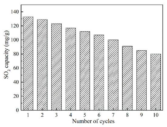 In order to measure the cyclic desulfurization performance of the prepared adsorbent, a thermal regeneration of Char-PA-CO2-48 is performed at 400 °C for 30 min in N2 atmosphere, and the corresponding result is given in Figure 10. The SO2 removal capacities of Char-PA-CO2-48 exhibit a general decreasing trend from 133.3 mg/g in the first-time desulfurization to 81.2 mg/g in the 10th cycle. Pi et al. [47] found that the pore structure and chemically active sites were damaged during a long-time (30 min), high-temperature (400 °C) and repeated thermal-treatment process, thus leading to rapidly decreased SO2 removal capacities.