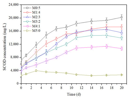 The hydrolysis of substrates can be expressed through the changes of SCOD [26]. The changes of SCOD concentrations at different CEPS/FW ratios during the coAD process are shown in Figure 1. In general, SCOD concentrations decreased with an increase of CEPS/FW ratios. For example, after 20 days, the SCOD concentrations were 20,184.36, 17,273.67, 15,512.38, 13,875.62, 10,668.02, and 2682.9 mg/L in the M0:5, M1:4, M2:3, M3:2, M4:1 and M5:0, respectively. Additionally, the SCOD concentrations at any CEPS/FW ratio had similar change trends, except for M5:0. For instance, the SCOD concentrations increased rapidly from 5200.53 to 15,296.48 mg/L within 11 days in the M1:4, then maintained relative stability. Meanwhile, the SCOD concentrations in the M5:0 increased from 2498.43 to 3948.7 mg/L in the first 3 days, then fluctuated in the range of 2455.22–3568.51 mg/L.