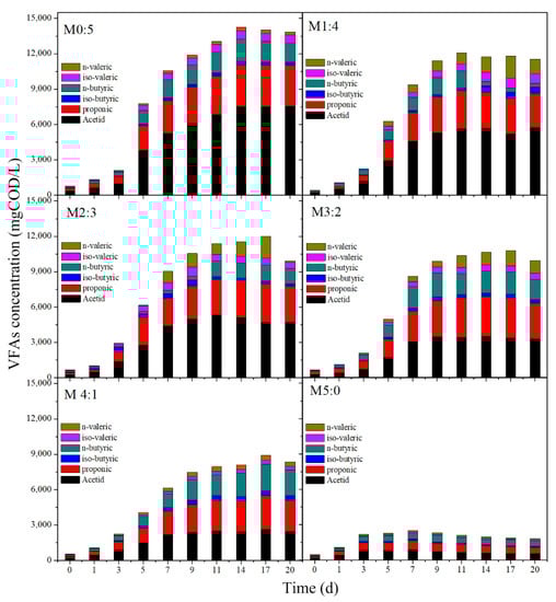VFAs are the major intermediate degradation products of soluble organics, with low molecular weight to biogas. The changes of VFAs concentrations and compositions at different CEPS/FW ratios are summarized in Figure 2. It is clear to see that the VFAs concentrations decreased with increases in the CEPS/FW ratio. After 20 days of coAD, total VFAs concentrations were 13,872.97, 11,556.97, 9929.39, 9958.97, 8367.02, and 1789.98 mg COD/L, in the M0:5, M1:4, M2:3, M3:2, M4:1, and M5:0, respectively. This tendency of VFAs concentrations indicates that the accumulation of VFAs was mainly caused by high FW content, and the addition of CEPS significantly alleviated the accumulation of VFAs.