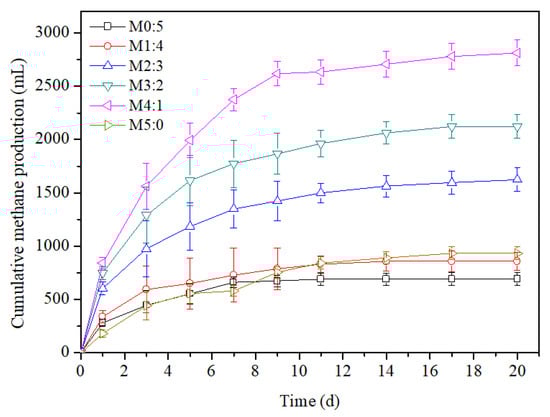 The cumulative biogas production was employed to evaluate the methanogenesis performances and the conversion efficiency of VFAs. The changes in cumulative biogas production with CEPS/FW ratios and coAD time are shown in Figure 3. It can be seen that the cumulative biogas production was profoundly affected by CEPS/FW. The highest cumulative biogas production (2812.27 mL) was detected in M4:1 on the 20th day of coAD, which was 4.08-, 3.28-, 1.73-, 1.32-, and 3.01-fold the amount present in M0:5, M1:4, M2:3, M3:2, and M5:0, respectively. Additionally, cumulative biogas production at any CEPS/FW ratio first rapidly increased with the extension of AD time, then gradually leveled off. For instance, in the M4:1, the cumulative biogas production increased rapidly to 2617.52 mL within 9 days, then remained relatively stable.